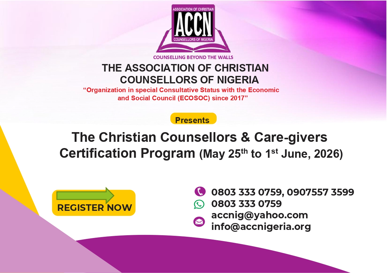 The Association of Christian Counsellors of Nigeria (ACCNIG) was incorporated in 2008 with the aim to obey the scriptural instruction to administer holistic Christian counselling to all seeking persons, God’s way.We are poised to harness the available resources to us to confront the issue of counselling in Nigeria. We aim: